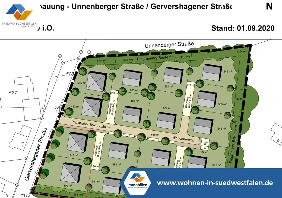 Das Baugebiet liegt im Geltungsbereich des Bebauungsplanes (B-Plan) 93 „Gervershagener Straße / Unnenberger Straße" und wurde im Frühjahr 2022 erschlossen. Die Erschließung des Grundstücks erfolgte vorteilhaft über einen Zugang von der Gevershagenerstraße aus mit attraktiver Sackgasse am Ende.