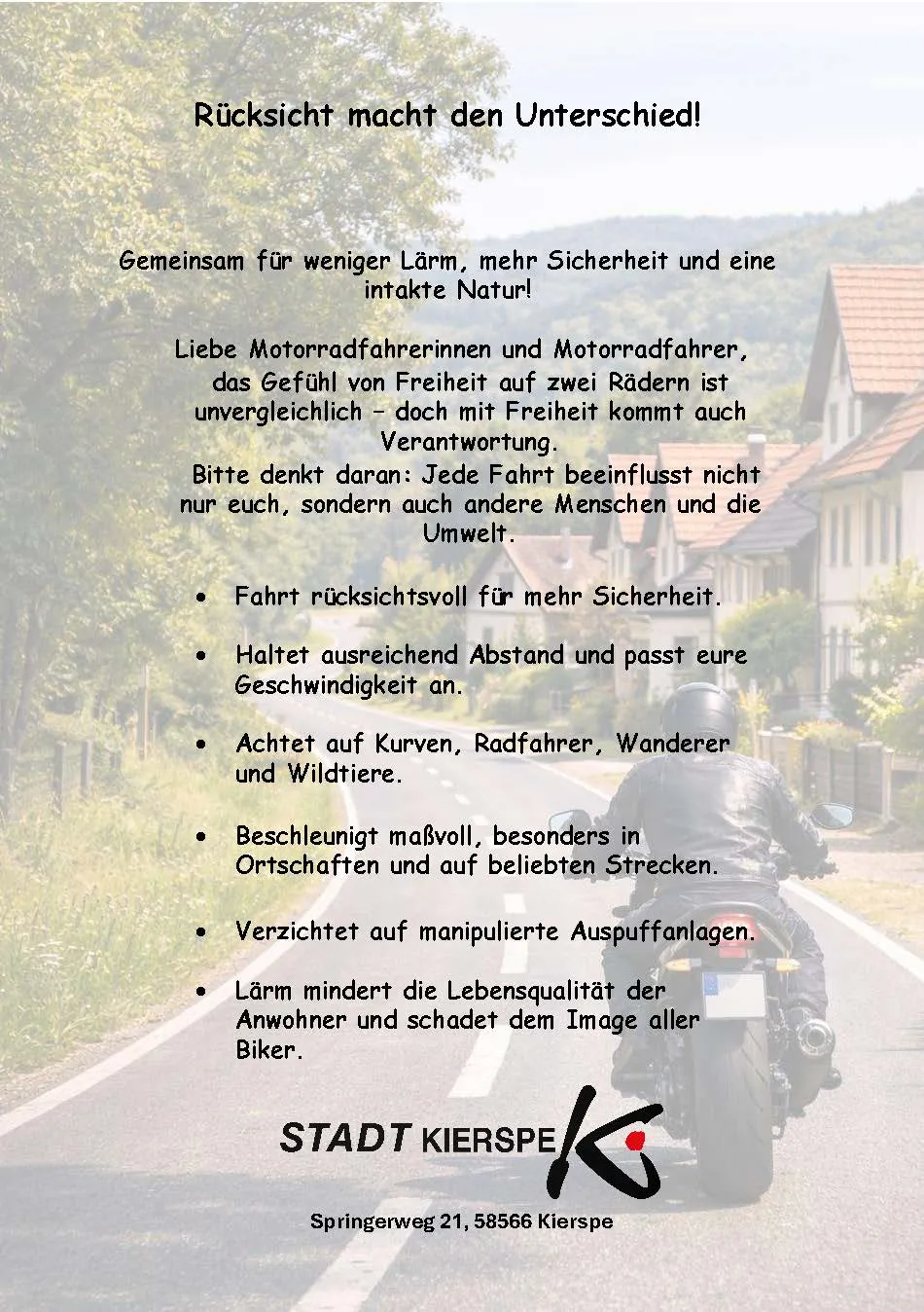 Beide sind seit der Gründung der Bürgerinitiative "Straßenlärm K2/K3" im Jahr 2020 dabei. Sie hätten sich zusätzlich zu dem Flyer jedoch auch mehr Kommunikation seitens der Verwaltung in Richtung der betroffenden Bürger gewünscht. „Wir hatten gehofft, man macht nochmal eine Bürgerversammlung, um das schwarze Peter Spiel zu vermeiden“, erklärt Günther Barth, kurz nachdem die Stadt Kierspe einen Flyer veröffentlicht hat. Dieser wurde "an bekannten Motorrad-Hotspots sowie in Gastronomiebetrieben im Umfeld der betroffenen Strecken ausgelegt", erklärt Hendrik Kasper von der Stadtverwaltung. Dazu zählen Eisdielen, Bäckerein oder Tankstellen, so Kasper weiter. Insgesamt wurden rund 400 Stück gedruckt. Der Flyer soll Motorradfahrer sensibilisieren, rücksichtsvoller zu fahren.