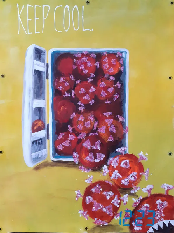 Es handelt sich um 40 Bilder auf PVC-Folien im Format 120 x 90 Zentimeter. In diesem Werk hat die Malerin die Pandemie und ihre Auswirkungen wie in einem Zeitraffer auf einen Tag komprimiert, verdeutlicht durch die Angabe der Uhrzeit auf den Bildern.
