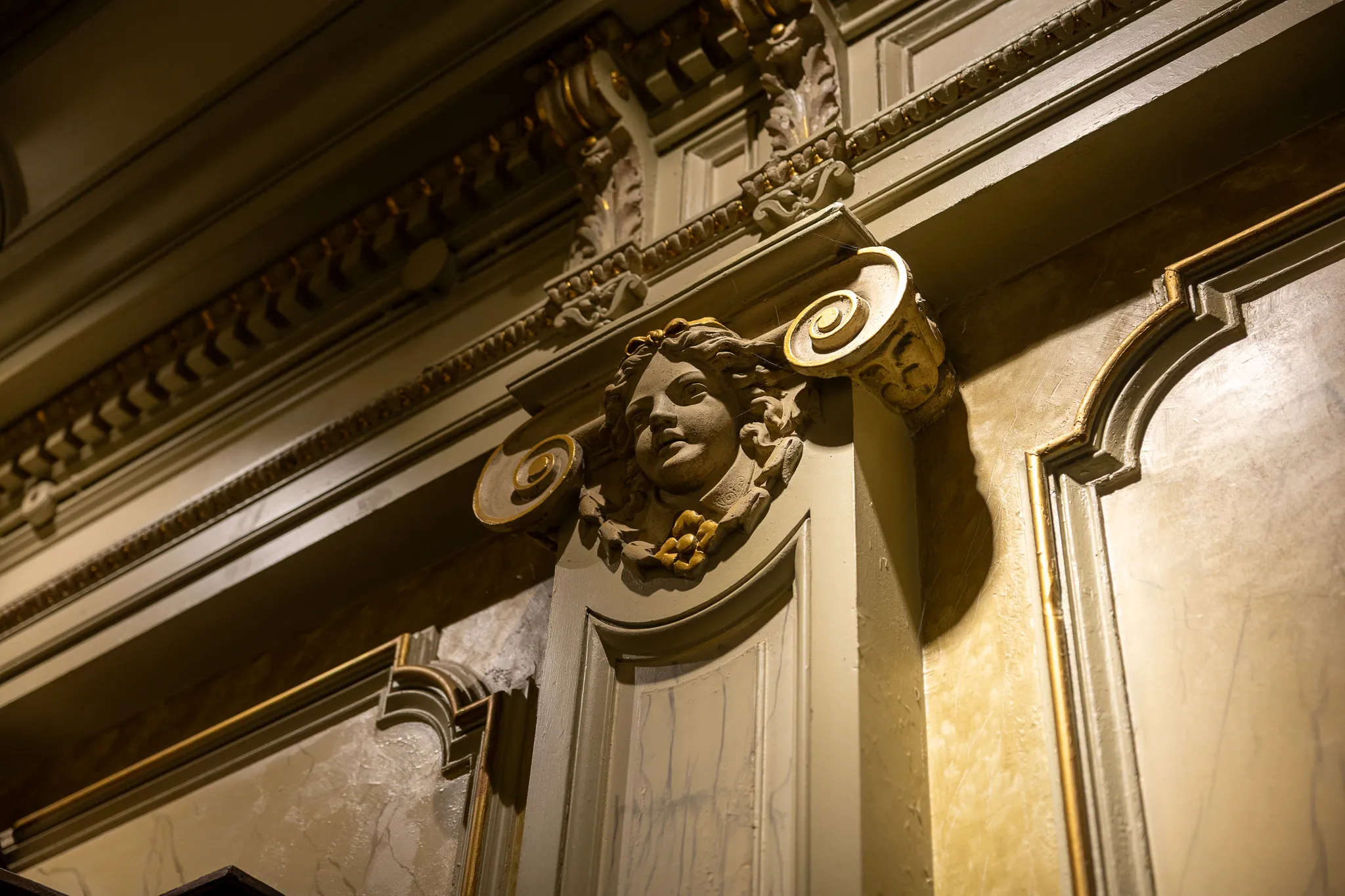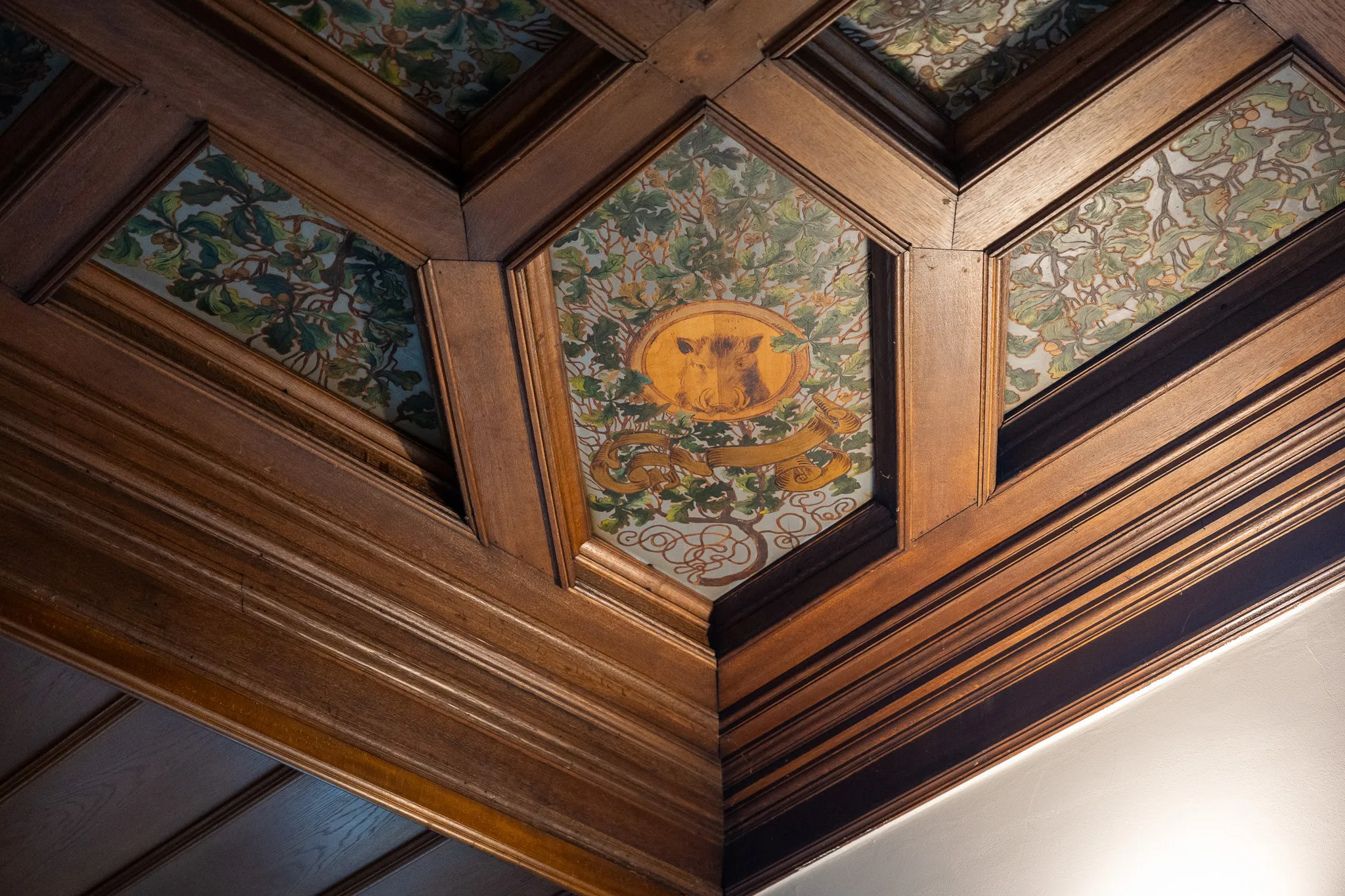Während wir sprechen, wandert der Blick nach oben: Ein großer Kronleuchter hängt über uns, getragen von einer Decke aus dunklen Holz-Kassettierungen. In den einzelnen Feldern sind sorgfältig gezeichnete florale Malereien zu erkennen.