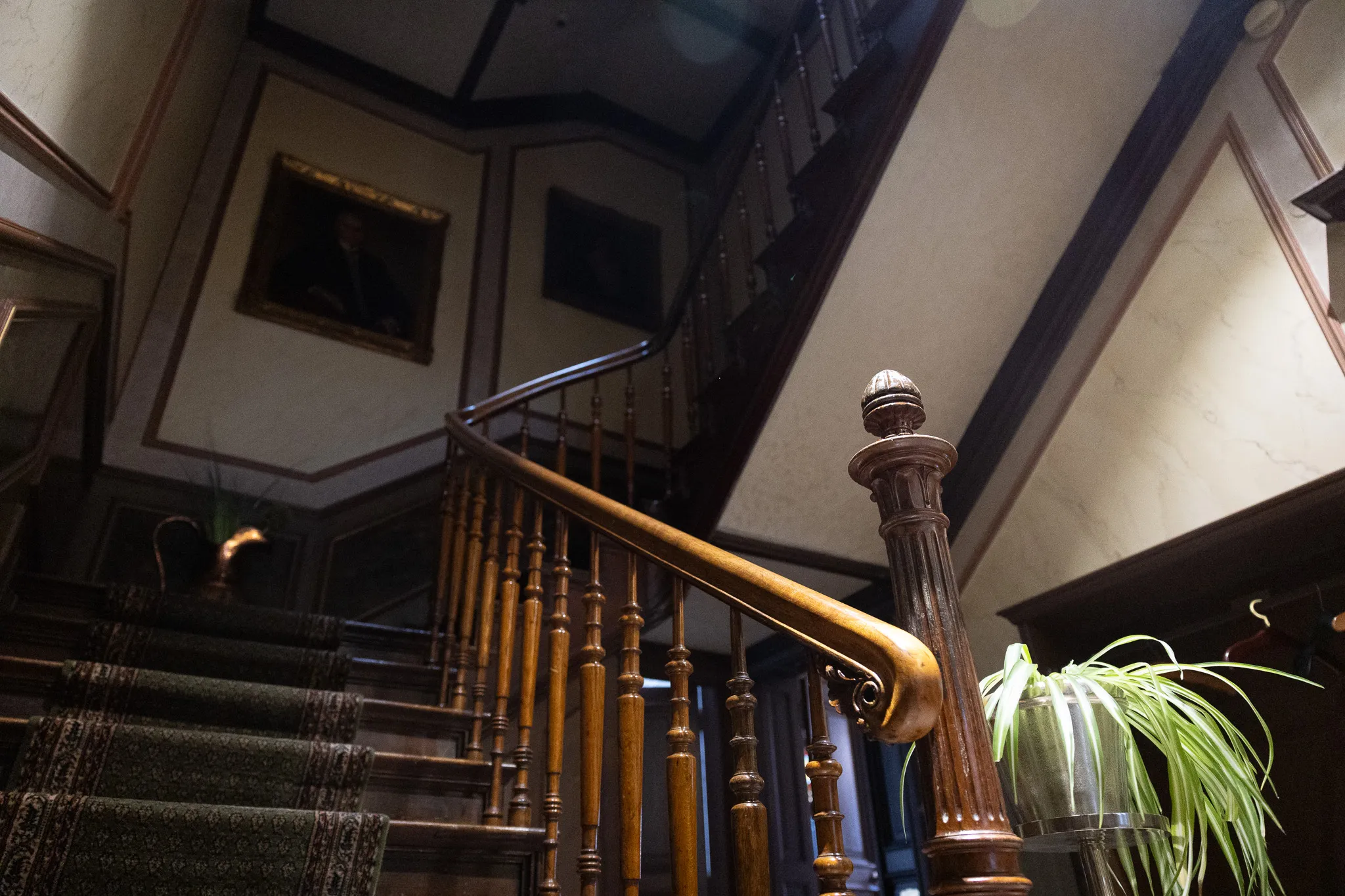 Durch den Eingangsbereich, in dem kunstvoll verzierte Holzpaneele und hervorstehende Stuckelemente an frühere Zeiten erinnern, führt sie uns vorbei an einer dunklen, rustikalen Holztreppe in ihr Büro. Auch hier finden sich die schweren Wandverkleidungen wieder, die dem Raum einen besonderen Charme verleihen.