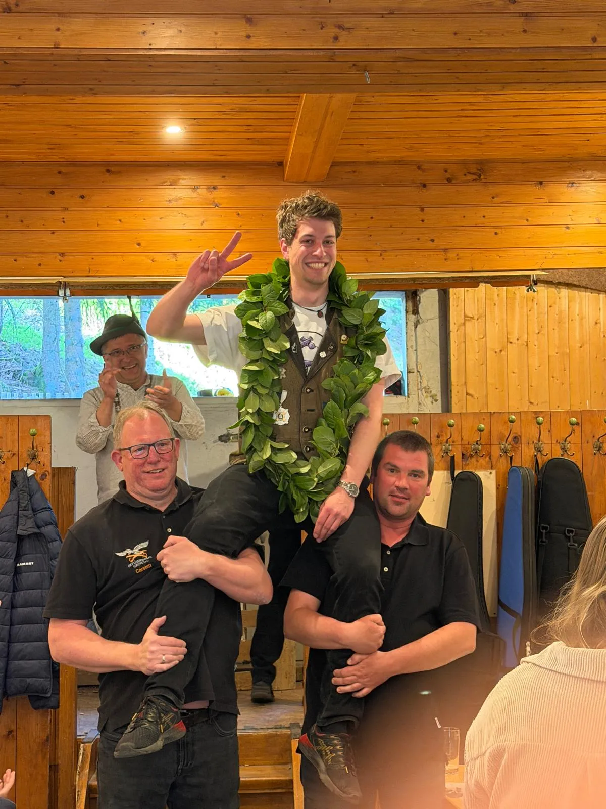 Es dauerte noch eine ganze spannende Weile, bis der Vogel bei den Erwachsenen die Stange verließ. Die Würde des Probevogelkönigs 2026 holte sich um 19.20 Uhr mit dem 831. Schuss Fabian Breuckmann, der seiner Freude freien Lauf ließ. Krone, Apfel, Zepter, linker und rechter Flügel wurden von Christian Hoffmann, Andre Hoffmann, Dirk Müller und Lara Göhausen zum Fallen gebracht.