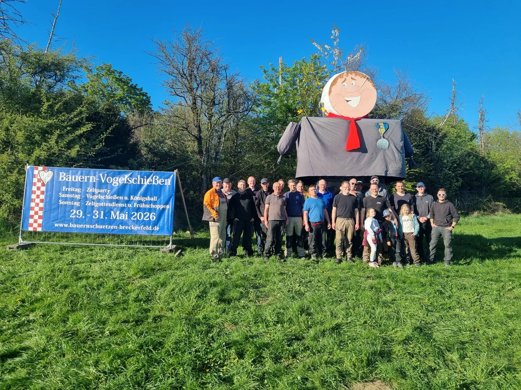 Gekleidet im traditionellen blauen Kittel und mit rotem Halstuch versehen, tragen die Str0hpuppen die typische Tracht der Bauernschützen und machen auf das bevorstehende Festwochenende vom 29. bis 31. Mai aufmerksam.