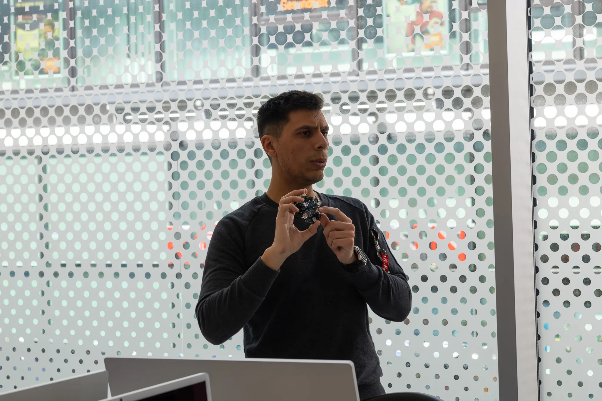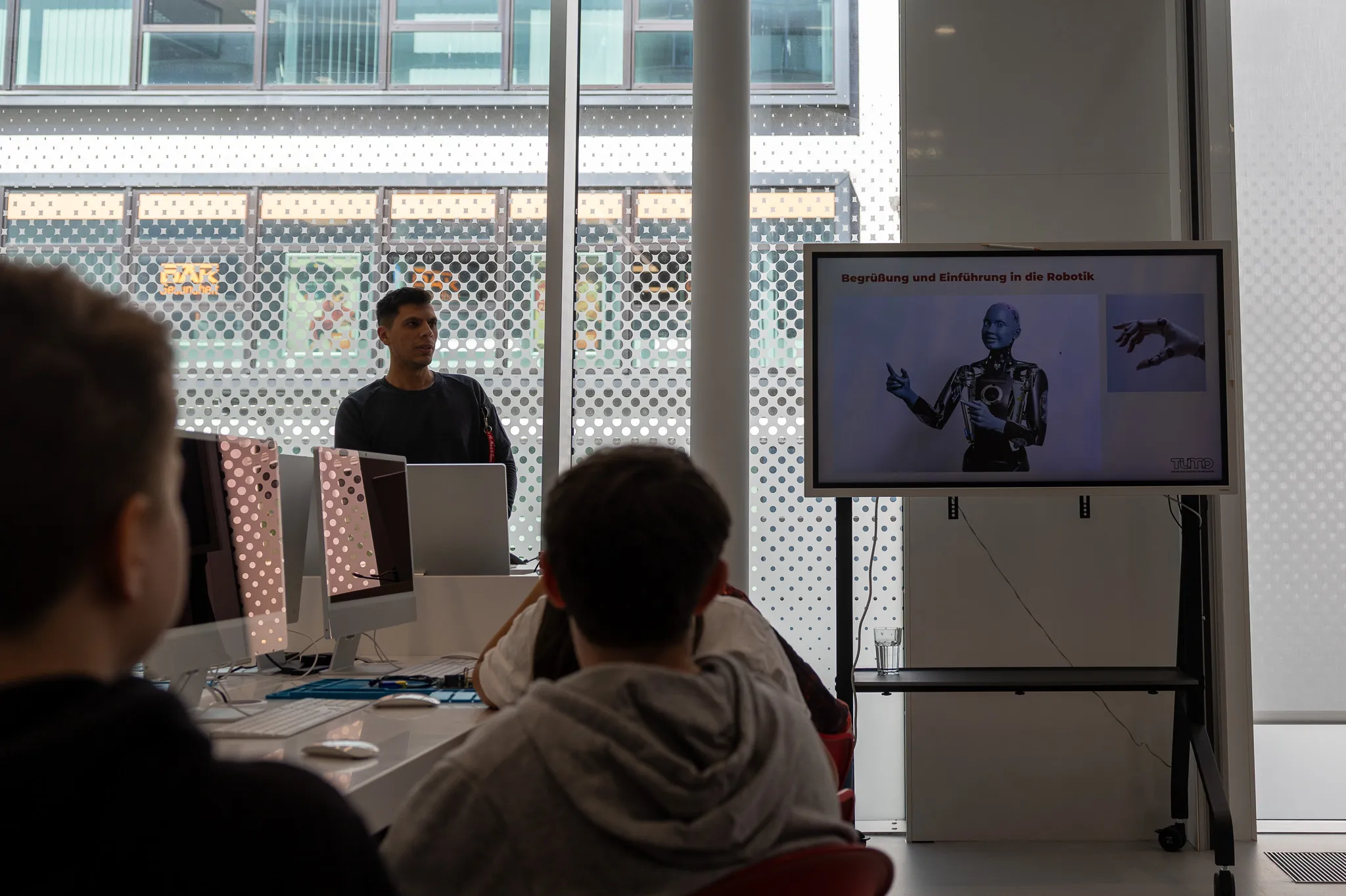 In den kommenden Wochen soll sich dies jedoch ändern: Workshopleiter Jood Jabbooli zeigt den Schülern, wie ein Mikrocontroller und die entsprechenden Sensoren aussehen und funktionieren. Hardware, Sensoren und LED-Leuchten sollen verstanden und programmiert werden, um dann im letzten Schritt ein selbstständig fahrendes Auto, das Farben (für Ampeln) erkennt, zu bauen.