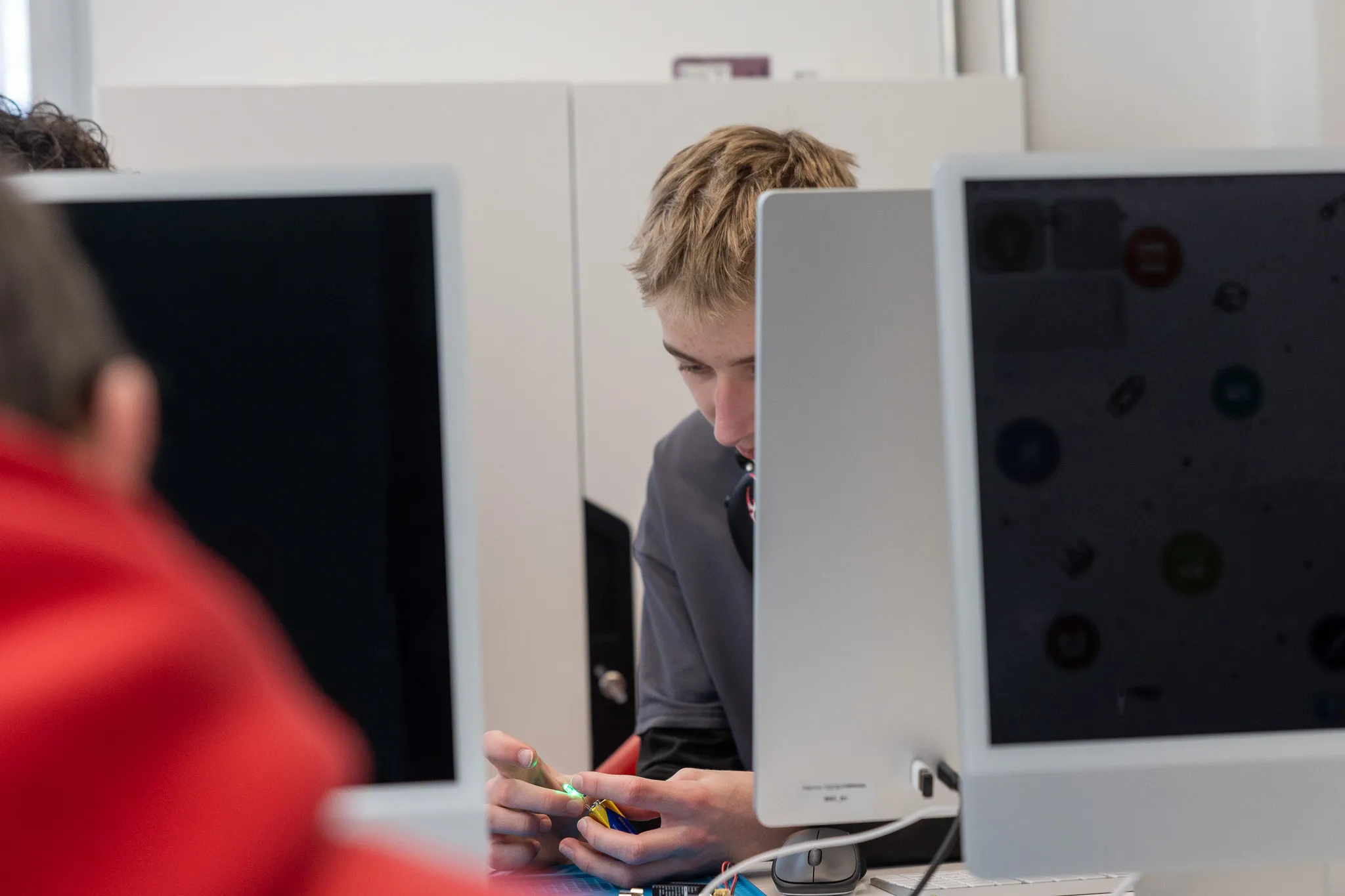 Der Einstieg in den Workshop fand am Donnerstag, 23. April, statt. Lehrer Ralph Sonnabend freute sich über die Begeisterung seiner Schüler: „Es tut ihnen gut, auch außerhalb der Schule zu lernen“, sagt er. „Das ist anders, intensiver.“ Zuvor haben die Schüler, für die Informatik das selbst gewählte vierte Hauptfach ist, schon mit kleinen Einplatinencomputern gearbeitet. „Aber wir haben viele theoretische Themen. Hier können die Schülerinnen und Schüler etwas eigenständig erarbeiten.“ An diesem ersten Workshoptag blieb es jedoch auch erst einmal theoretisch. Zum Beispiel bei der Frage, wie viel künstliche Intelligenz in einer Alexa, in einem Staubsaugerroboter oder in der Waschmaschine steckt. Oder welche Sensoren dafür verantwortlich sind, dass diese Geräte ihre Funktionen selbstständig ausführen können.